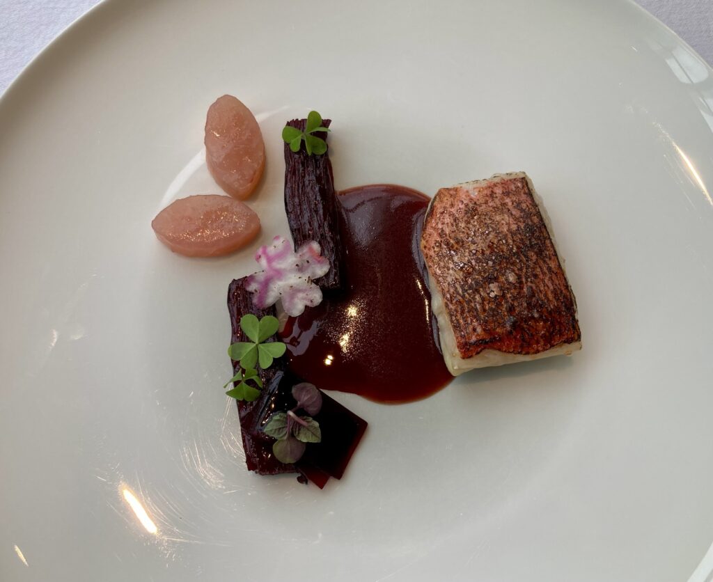 金目鯛の炙り蒸し ビーツのミルフィーユ 赤ワインのジュ・ソース
