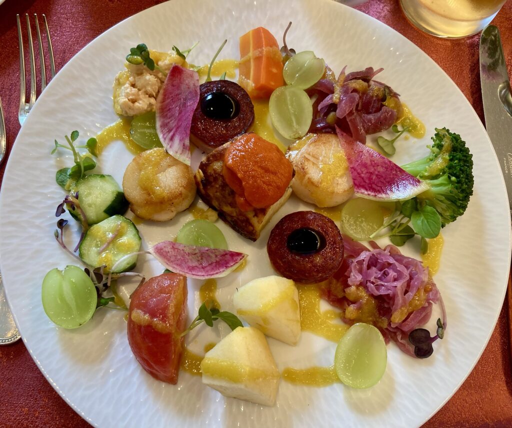 まわりには帆立、ソーセージ、季節のお野菜やフルーツ、紫キャベツのラペなどが盛り付けてあります。