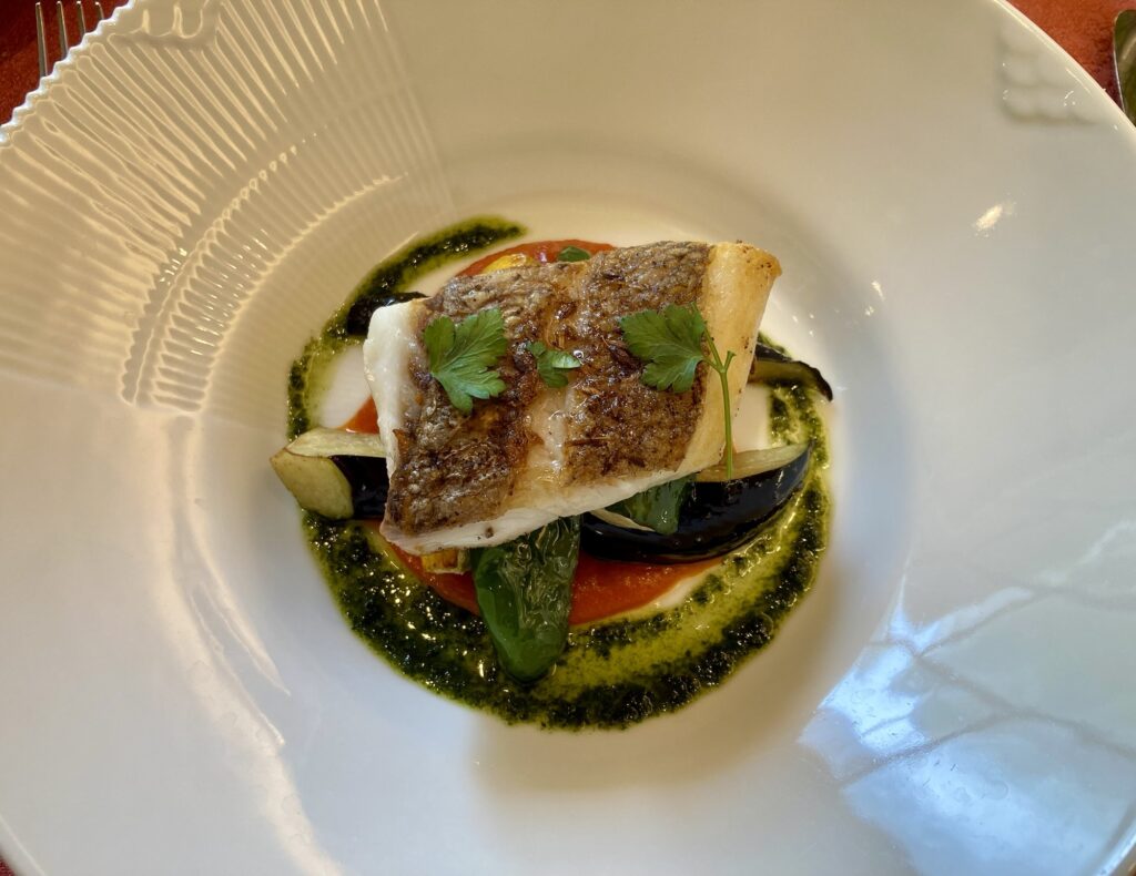 鯛の下には、茄子・ズッキーニ・ピーマンが敷いてあり、その下にトマトソースとバジルソースです。