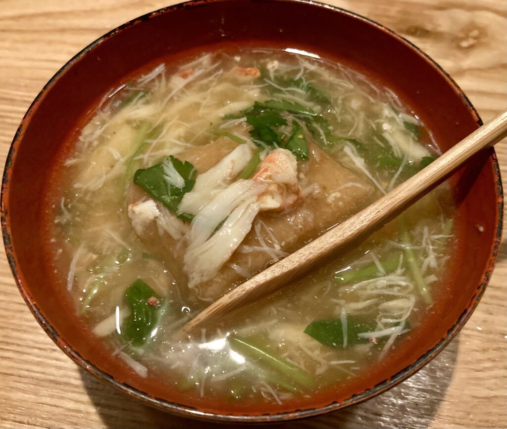 毛蟹がたっぷり入っています。中には焼き茄子が入っていて贅沢な一品でした。