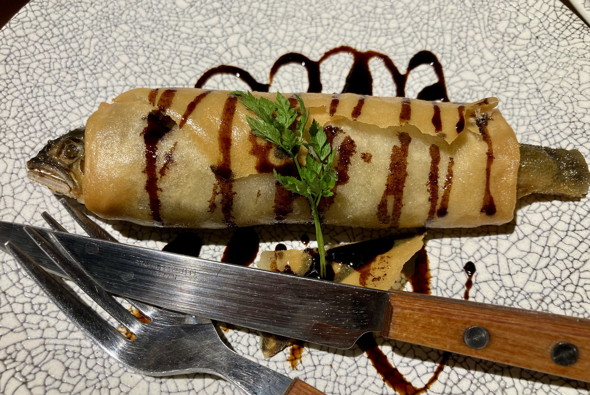 鮎の春巻きと黒酢の組み合わせは珍しいですが、相性が良くて驚きました!