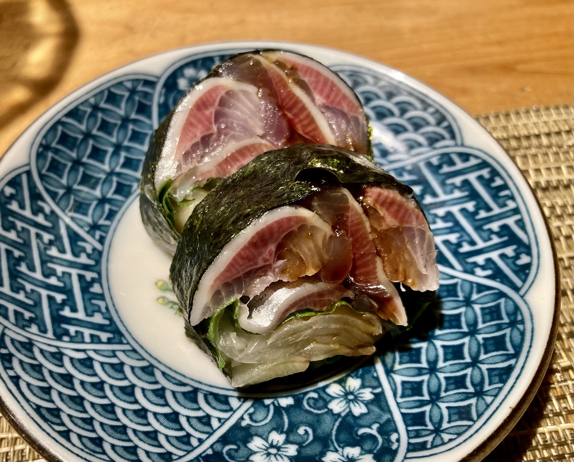鰯にしそ、ネギ、ガリが一緒に巻かれています。