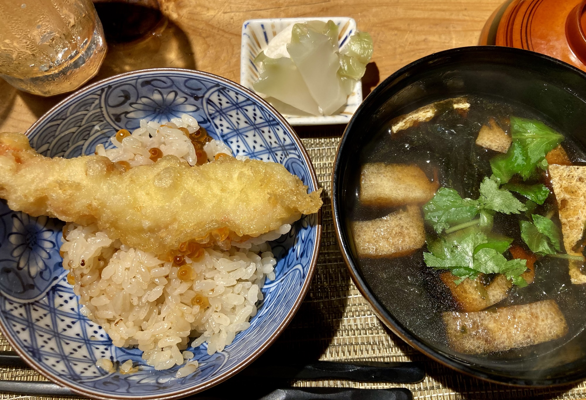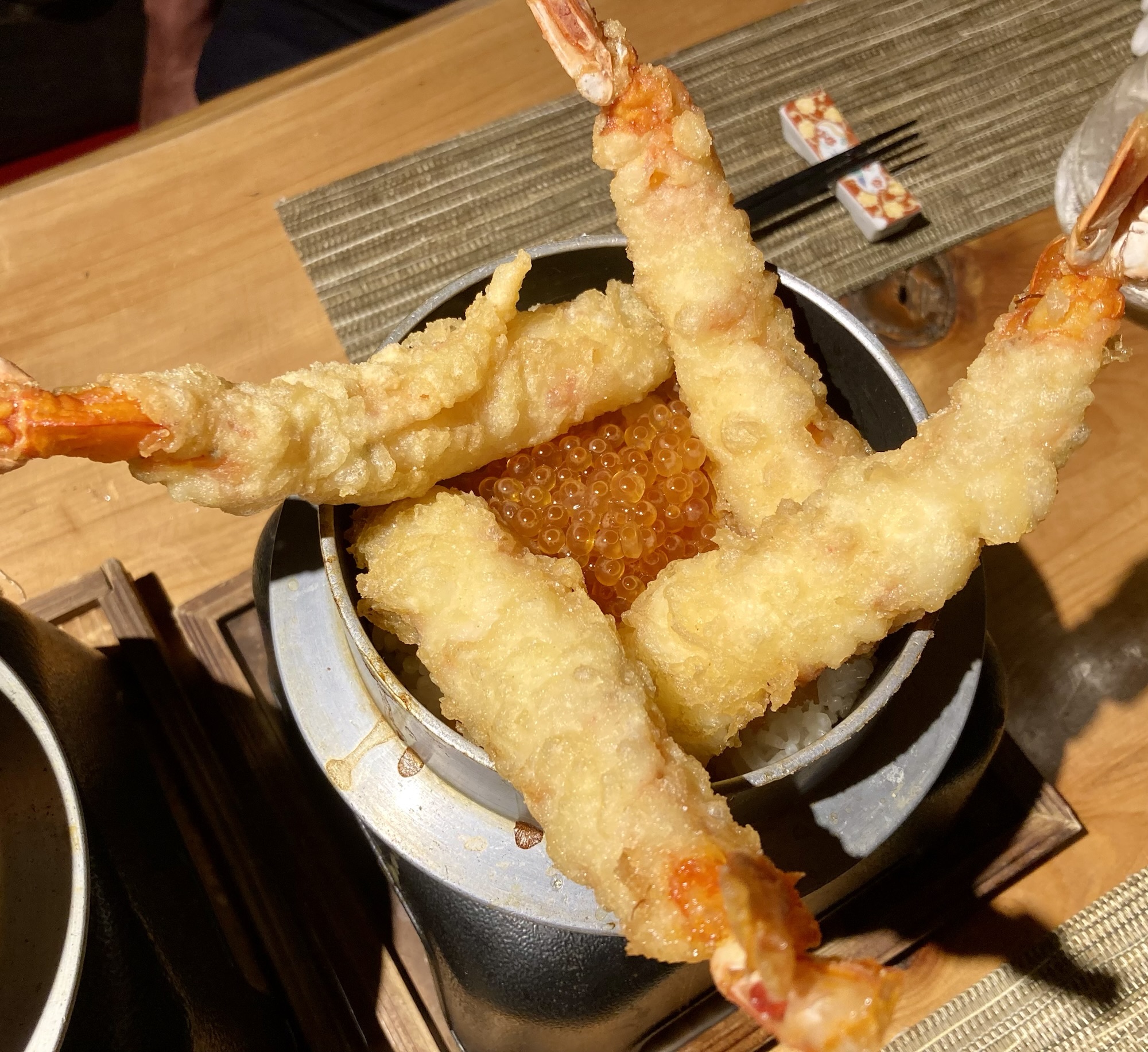 写真におさまらないほど大きな海老天とたっぷりのいくらです。